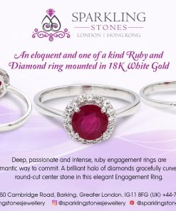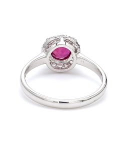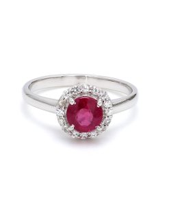 Bold and passionate, ruby is the gem of the heart. A true classic, this elegant Ruby and diamond halo ring can be for everyday or your engagement. Crafted in 18k white gold, it features a deep pink faceted Ruby surrounded by a glittering halo of petite round brilliant-cut diamonds.