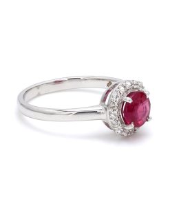 Bold and passionate, ruby is the gem of the heart. A true classic, this elegant Ruby and diamond halo ring can be for everyday or your engagement. Crafted in 18k white gold, it features a deep pink faceted Ruby surrounded by a glittering halo of petite round brilliant-cut diamonds.